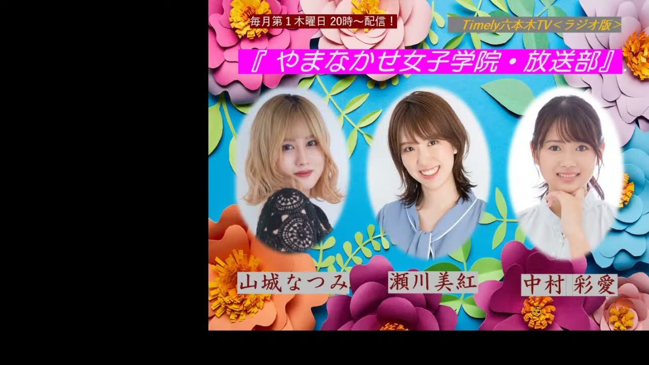 タイムリー 六本木TV <ラジオ版> 「やまなかせ女子学院・放送部」タイムリー 六本木TV <ラジオ版>「やまなかせ女子学院・放送部」 ★5/4(木)20時〜、YouTubeLiveにて生配信!出演:瀬川美紅、山城なつみ、中村彩愛https://youtube.com/live/akdhqhdJq0w<ラジオ版>「やまなかせ女子学院・放送部」#14タイムリー六本木TV<ラジオ版>毎週木曜日の20時~生配信あくまで<ラジオ版>として音声にてお楽しみ下さい!第1木曜日は「やまなかせ女子学院・放送部」 出演;瀬川美紅、山城なつみ、中村彩愛たくさんのコメントお待ちしております。D.(顧問?)酒田youtube.comたくさんのコメントお待ちしています!