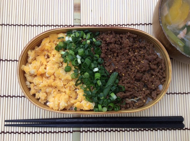 旦那さんのお弁当 そぼろごはんとスープ(*Ü*)ノ"☀おはようございます(◍•◡•◍)♡♬☆肉そぼろ☆たまごそぼろ☆ダシダのスープ(パプリカ+小ねぎ+玉ねぎ+チャーシュー+春雨)今週も始まりましたね(๑˃̵ᴗ˂̵)و