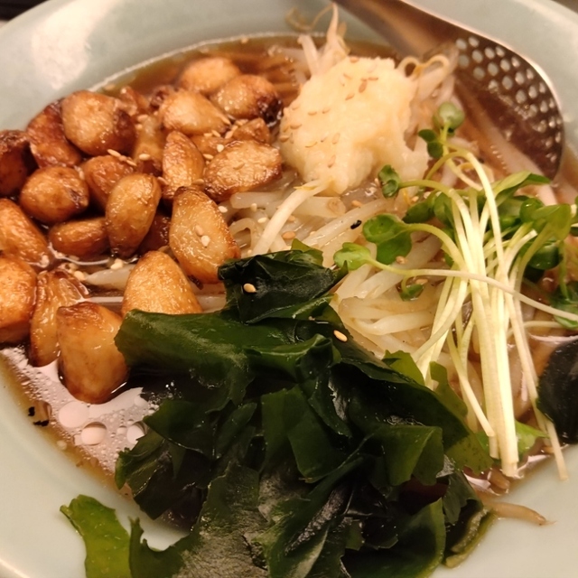 人気はやはり名物のニンニクラーメン。最初は普通に食べれる程度だろうと思っていたのですが、本当ににんにくが100個近く入ることもあるようで、私が頼んだラーメンも少なくとも80個以上は入っていました。魚介から丁寧に取った出汁、それにニンニク100個を入れるため、繊細な魚介出汁を壊してしまうと思いきや、意外にもにんにくの旨味、魚介の旨味が調和して食べやすいラーメンになっています。とはいえ、お客さんも言うように、どれだけ食べてもにんにくが減らず、麺の中から次々と湧いて出てくる様子は少し焦りました…