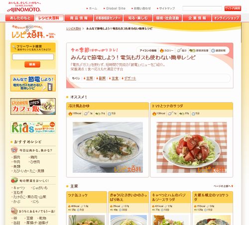 味の素は、同社の運営するサイト「レシピ大百科」において、電気もガスも使わない“節電メニュー”を3月15日から公開している