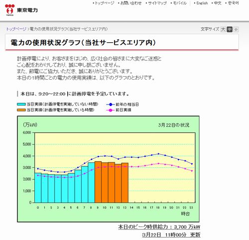 「電力使用状況グラフ」は、1時間ごとの電力使用実績を棒グラフで表示するもの。計画停電を実施している時間、していない時間が色分けされているほか、前年同日と前日の実績を折れ線グラフで表示し、併せて確認可能だ。http://www.narinari.com/site_img/photo/2011-03-22-151336.jpg