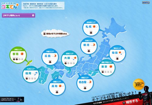 春が訪れ、気温が上昇すると共に、次第に動きを活発化させるゴキブリ。どれほどの人が忌み嫌おうとも、シーズン(?)が到来すれば否応なく対面する機会は増えるが、ライオンは、そんなゴキブリの活動情報をまとめた「ゴキブリ天気予報~ゴキてん~」(http://gokiten.varsan.jp/)を「バルサン」特設サイト内で提供している。