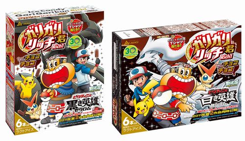 今回登場する「ガリガリ君リッチ チョコチョコ」は、7月16日公開の「劇場版ポケットモンスターベストウイッシュ『ビクティニと黒き英雄ゼクロム/ビクティニと白き英雄レシラム』」とのコラボ。パッケージはモンスターボールを手にしたガリガリ君、サトシとピカチュウ、ビクティニなどが描かれたスペシャルなデザインとなっている。