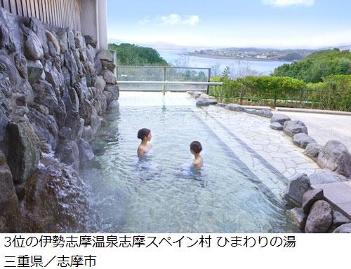 また、2位には広々とした露天から、昼は富士山の勇姿、夜には新日本三大夜景の甲府盆地を見下ろす「ほったらかし温泉 あっちの湯・こっちの湯」(山梨県)、3位には伊雑ノ浦を眺望できる露天風呂が人気の「伊勢志摩温泉志摩スペイン村 ひまわりの湯」(三重県)が選ばれるなど、絶景を望む露天風呂に人気が集まっている。