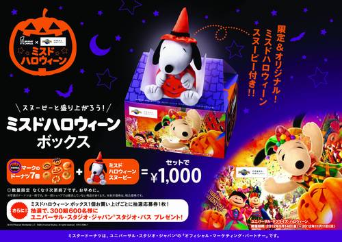 このキャンペーンは、ハロウィーンをテーマに開発した新商品6アイテムを販売するほか、ドーナツとオリジナルグッズ、そしてユニバーサル・スタジオ・ジャパン スタジオ・パスが当たる抽選応募券をセットにした「ミスドハロウィーンボックス」(10月1日~11月11日、ショップ在庫が無くなり次第販売終了)を発売。オリジナルグッズは、PEANUTSとミスタードーナツがコラボした「ミスドハロウィーンスヌーピー」だ。