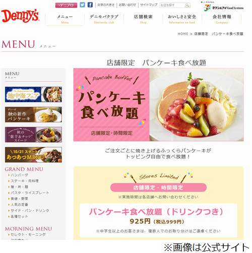 ファミレスチェーン「デニーズ」は、店舗限定・時間限定の「パンケーキ食べ放題」を、10月16日より開始した。実施時間は各店舗へ要問い合わせ。