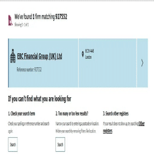 例えば、EBC Financial Groupは、規制番号である「927552」と入力し、「Search」をクリックすると、該当する情報を確認できます。ここでEBC Financial Groupは一つの選択肢のみ表示されるため、情報が正しく一致していることを確認すれば、基本的に問題はありません。