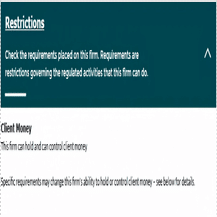 Client Money(顧客資金の取り扱い)を確認:「Client Money」 の項目は、必ず 「Can hold and can control」である必要があります。これは営業資格を持っているかどうかを判断するための重要なポイントです。もし「Can hold and can control」でない場合、そのブローカーは投資コンサルティングライセンスのみを持っている可能性が高く、営業活動を行う権限はありません。