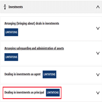 上記の2点を確認した後、最後に「Investments」欄の「Dealing in investments as principal」をクリックすることで、 STPライセンスかどうかを確認します。
