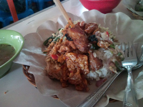 身振り手振りでナシチャンプルとビンタンを注文する。