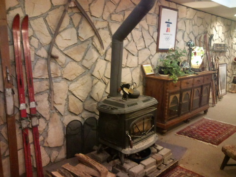 ロビーには暖炉と薪、そして暖炉の横には古めかしいスキーが並べてある。