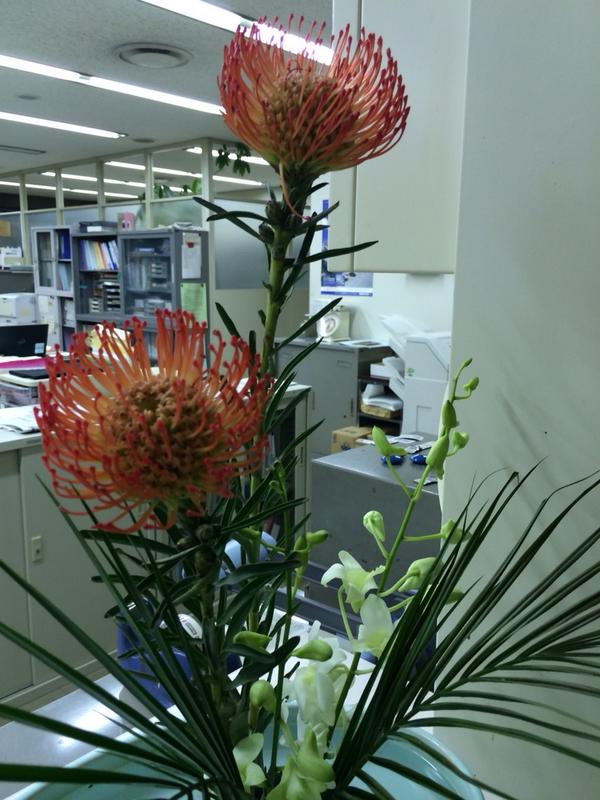 議会事務局のカウンターのお花。いつも綺麗です。赤い花はピンクッションって言うんですって。 pic.twitter.com/HegOyHHyEf