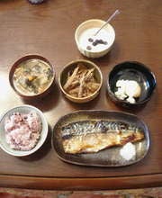 ★ごはん・・・ これって、お赤飯に見えるけど新米に「もち黒米」を大匙一杯入れて炊いただけです。すると、こういう風に赤飯っぽくなって、更にモチモチとなります。