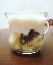 刻んだリンゴの上に同じく刻んだプルーンを入れて、最後にヨーグルトを100g上からポッタ~ン♪美味しいですよ。