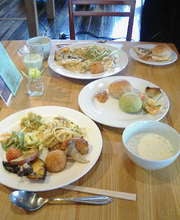 一皿目はこ~んな感じ。一皿目って事は・・・?そう、二皿目も食べたので~す。^^; 白いパンは黒豆のパン。そして緑のパンは「小松菜のパン」で、ジャムは梨のジャムでした。パスタは、ペペロンチーノ。