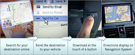 GoogleとYahooの地図サイトには、新しい「Send to Car」アイコンが追加され、これによりユーザーの希望に合わせてカスタマイズされた順路、地図、住所、および地点がベンツのGPSナビゲーションシステムへと送信することができるようになる予定。