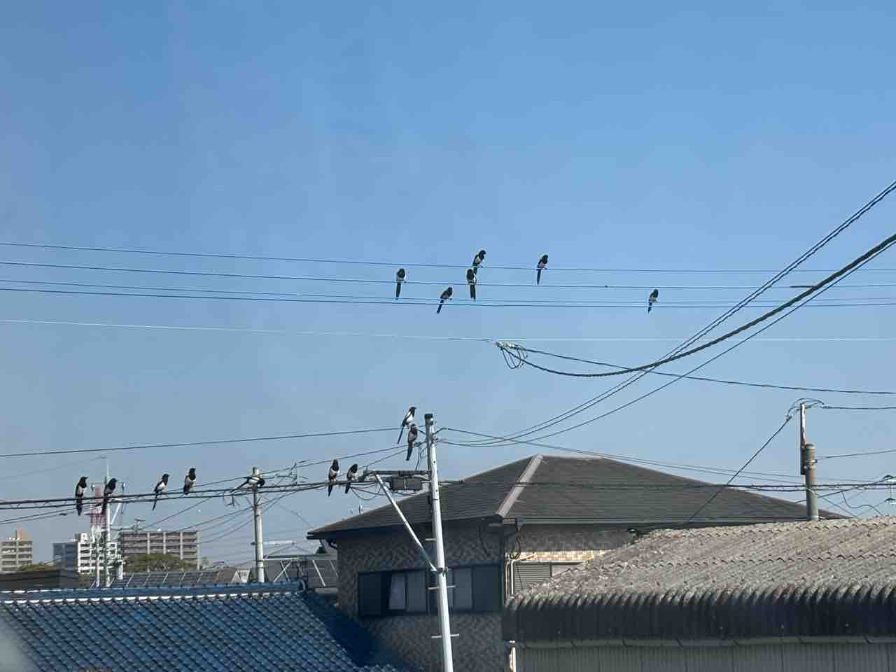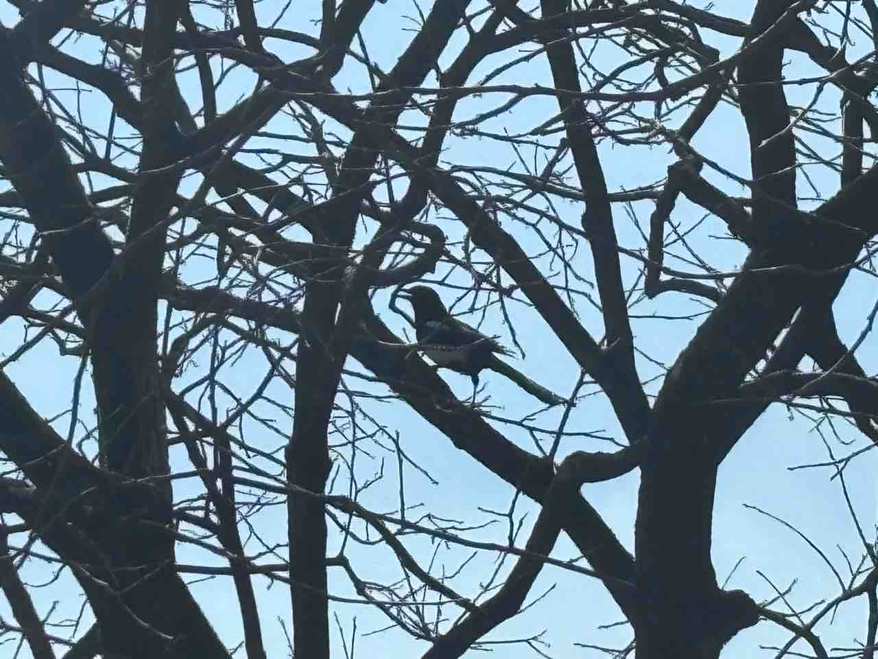 カササギの巣作り?今朝はカササギの集団が玄関先に集合、20羽程でガヤガヤとうるさく会話してました、猫餌のあまりを食べに来るのですが普通7羽位、今日は天気もよく近くの群れも来たのでしょう。又しばらくすると裏の柿の木に2羽のカササギが枝木を咥え巣作りを始めました。カササギは高い木の上に作るので柿の木に作るのは珍しい、縁側から見渡せるので巣作りから子育て、巣立ちまで観察出来ると楽しみになると思ってましたが中々小枝が組めないらしく巣作りを諦めました。残念です。ここはカラスもよく来るので難しかったです。