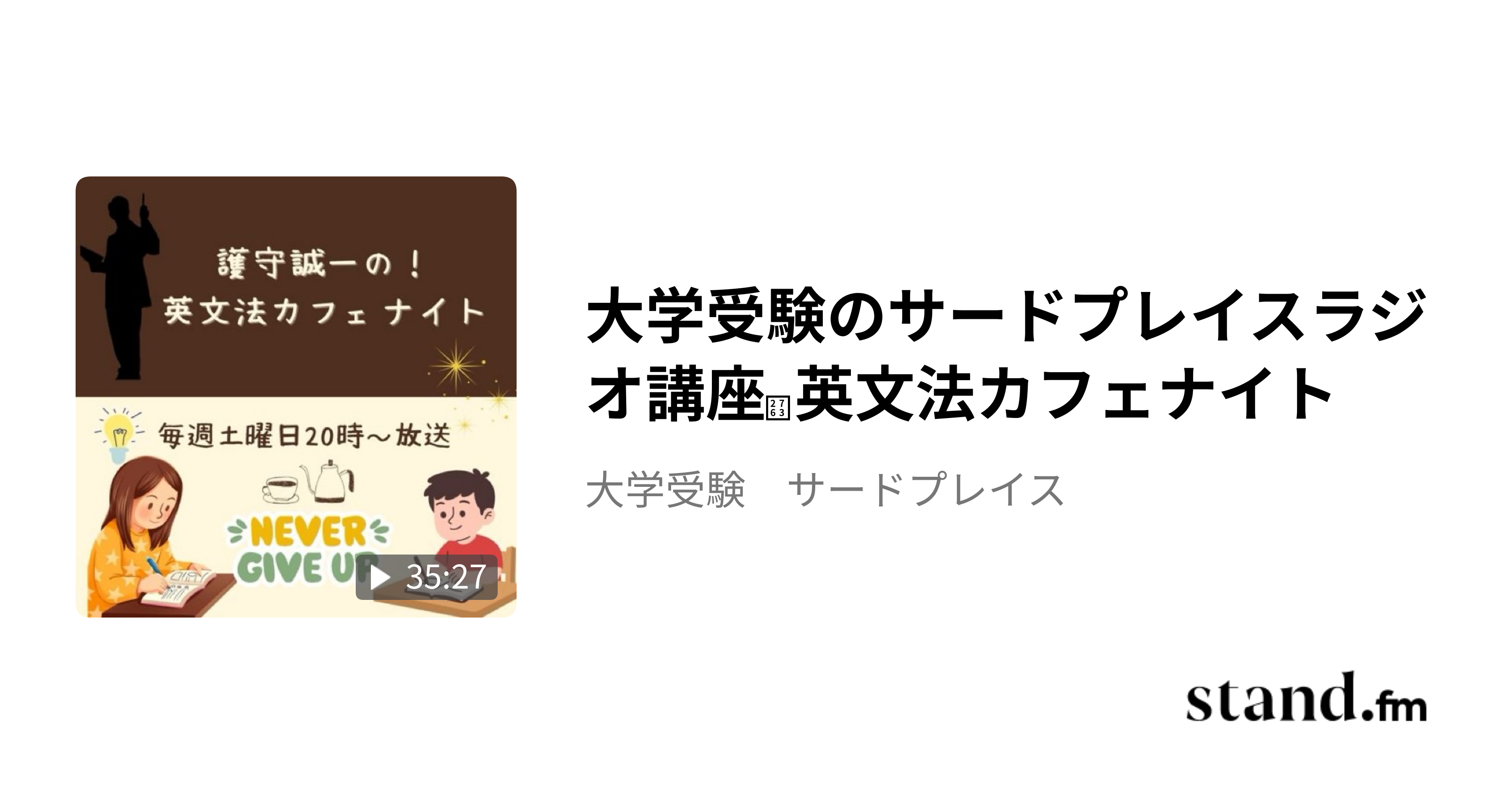 大学受験のサードプレイスラジオ講座❣️英文法カフェナイト - 大学受験 サードプレイス | stand.fm☕📚 大学受験のサードプレイス 提供 🎙 護守誠一の英文法カフェナイト 第2回 📌 テーマ:「関係詞――英文を“つなぐ”見えない糸」 ⸻ 英語の文法の中でも、受験生が苦手としやすいのが「関係詞」。 who、which、that、where、when…。 一見シンプルな単語ながら、その文構造は複雑で、読解・文法・英作文すべて…stand.fm