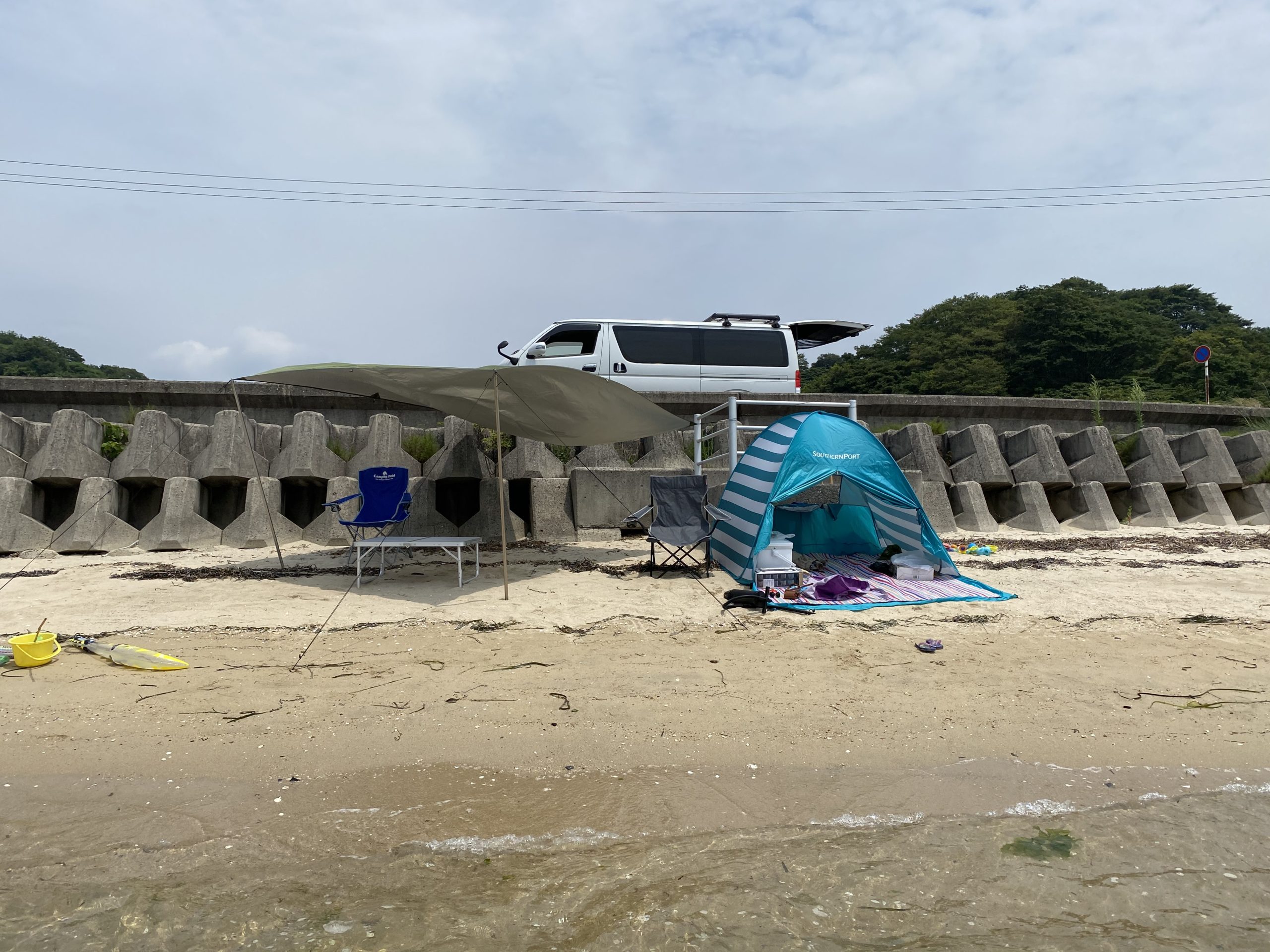 この島は海水浴場とオートキャンプ場があるのですが、我が家は浮き物系がやたら多いのと、静かに寛ぎたいというのがあって、そこへは行かず手前の砂浜でいつも泳いでます