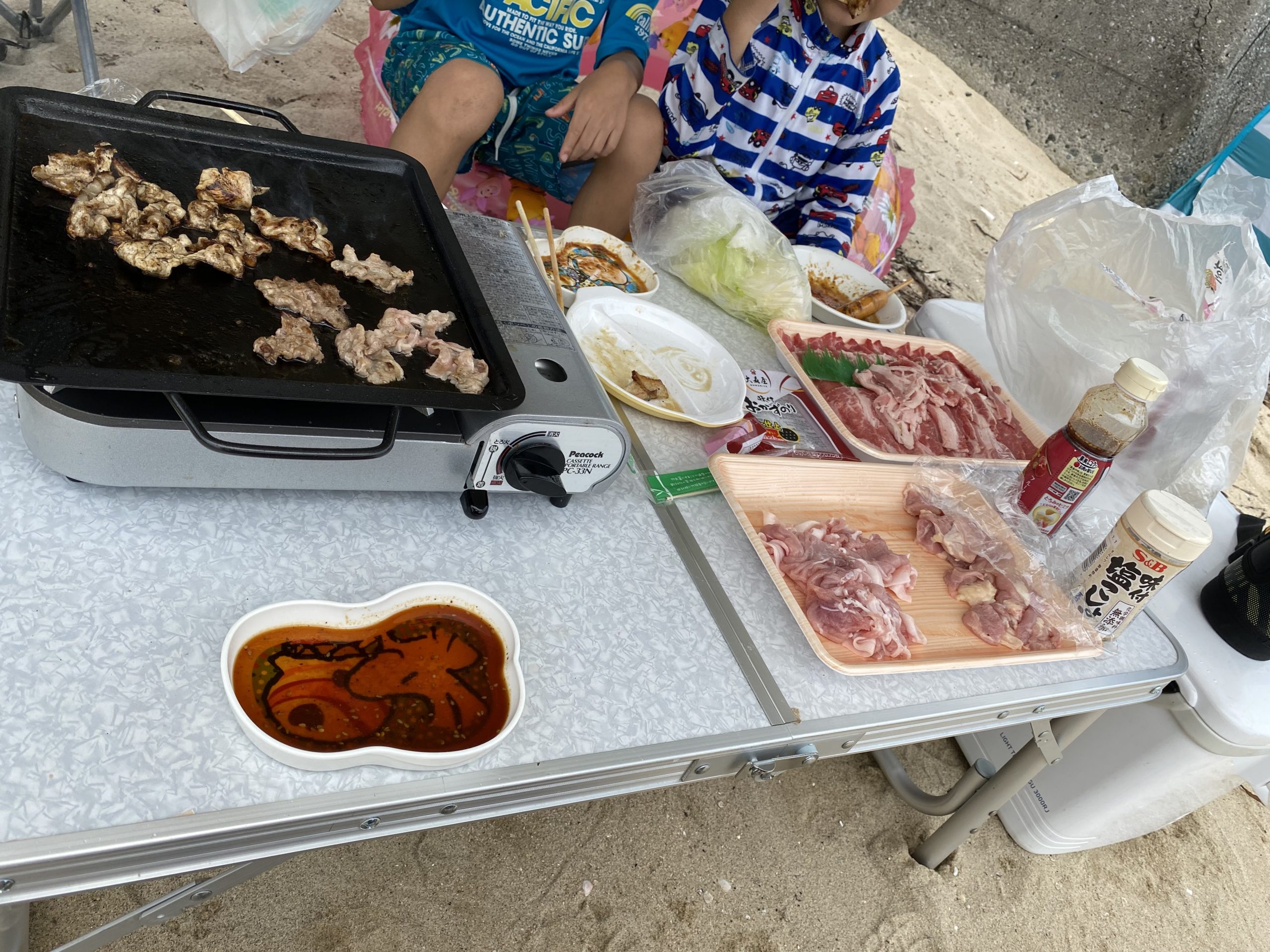 で、とりあえず日よけテントとタープを設営して出発が遅かったので、すぐ昼飯の準備もしておきます。その間嫁子供は既に海!
