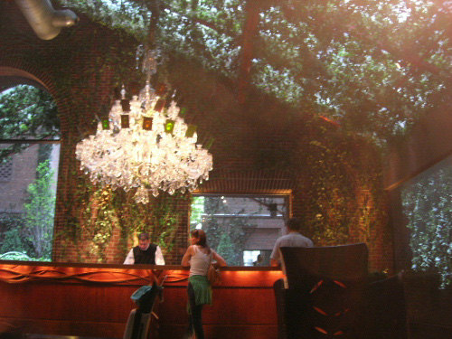 エントランスを入るとすぐにイエローカラーの間接照明が組み込まれているエスカレータを上がり、ロビーが現れる。ロビーはつたが絡まっているスカイライトから木漏れ日が差し込むレンガ造りのクラシックスタイルで、外観とのギャップに驚かされる。