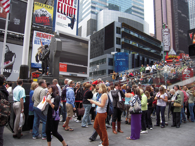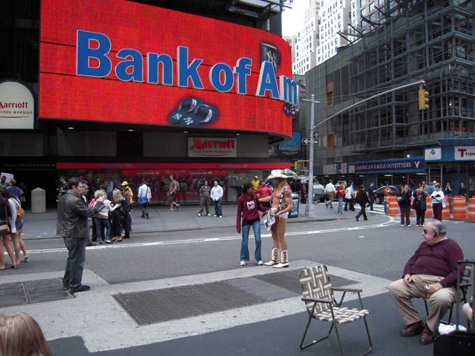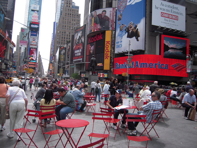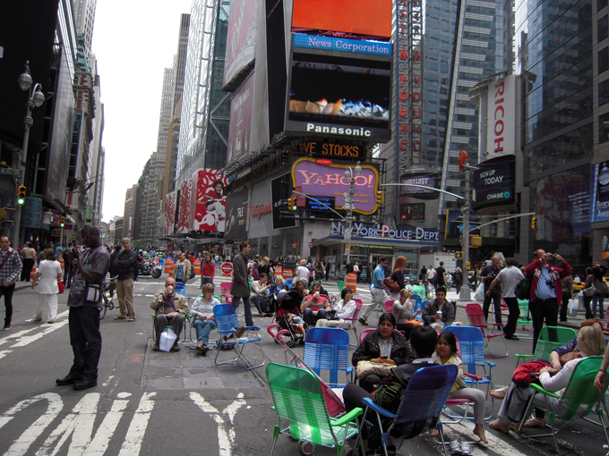 05-30-09-TIMES SQUARE-インフルエンザが流行ってますが、こちらではマスクをしてる人はあまり見かけません。している人がいたらむしろ目立つかもしれない。いたって普通の生活を送っています。タイムズスクエアが歩行者天国になり、観光客にとっての休憩場所となりました。行う政策が大胆なところがさすがです。