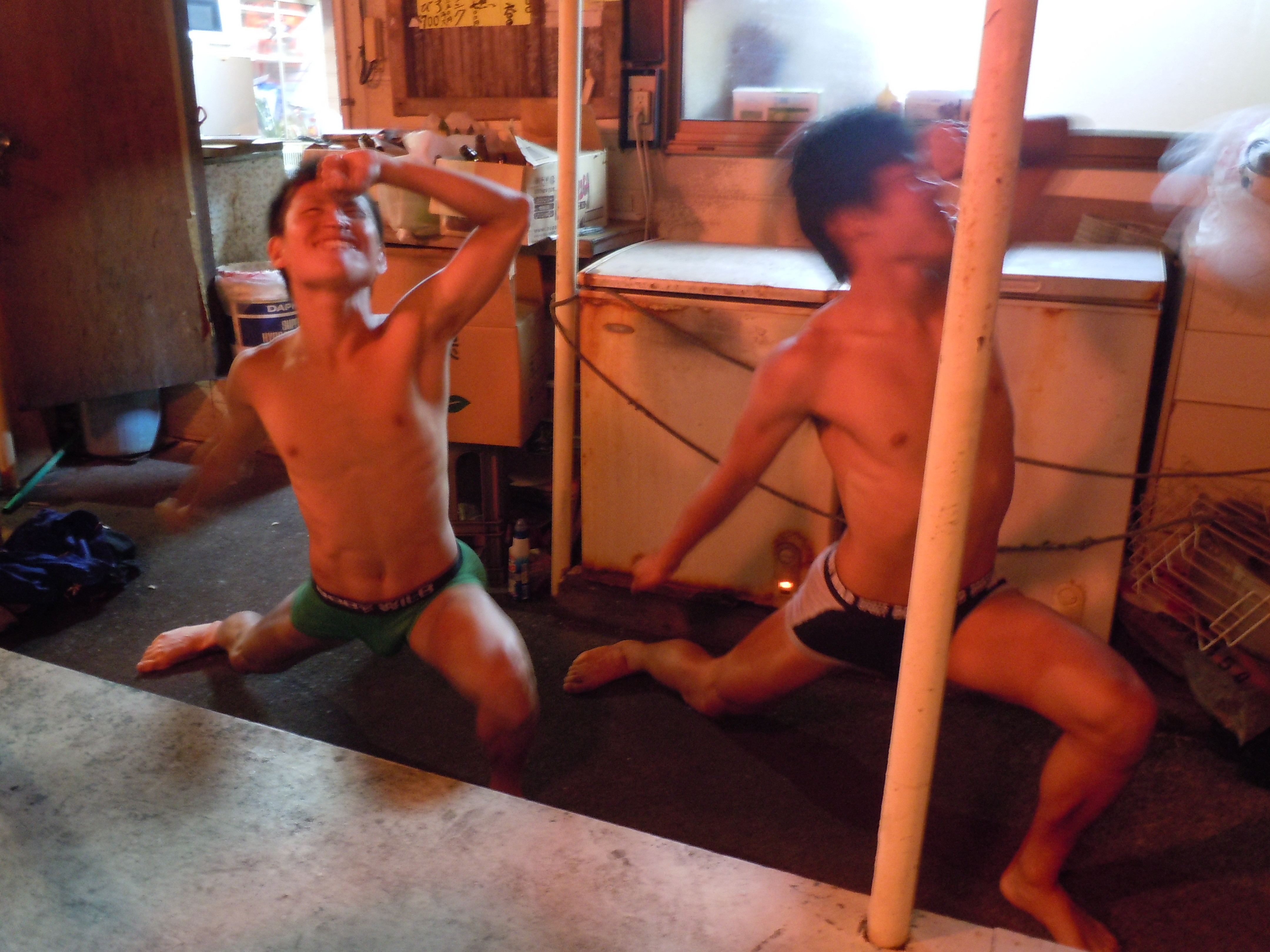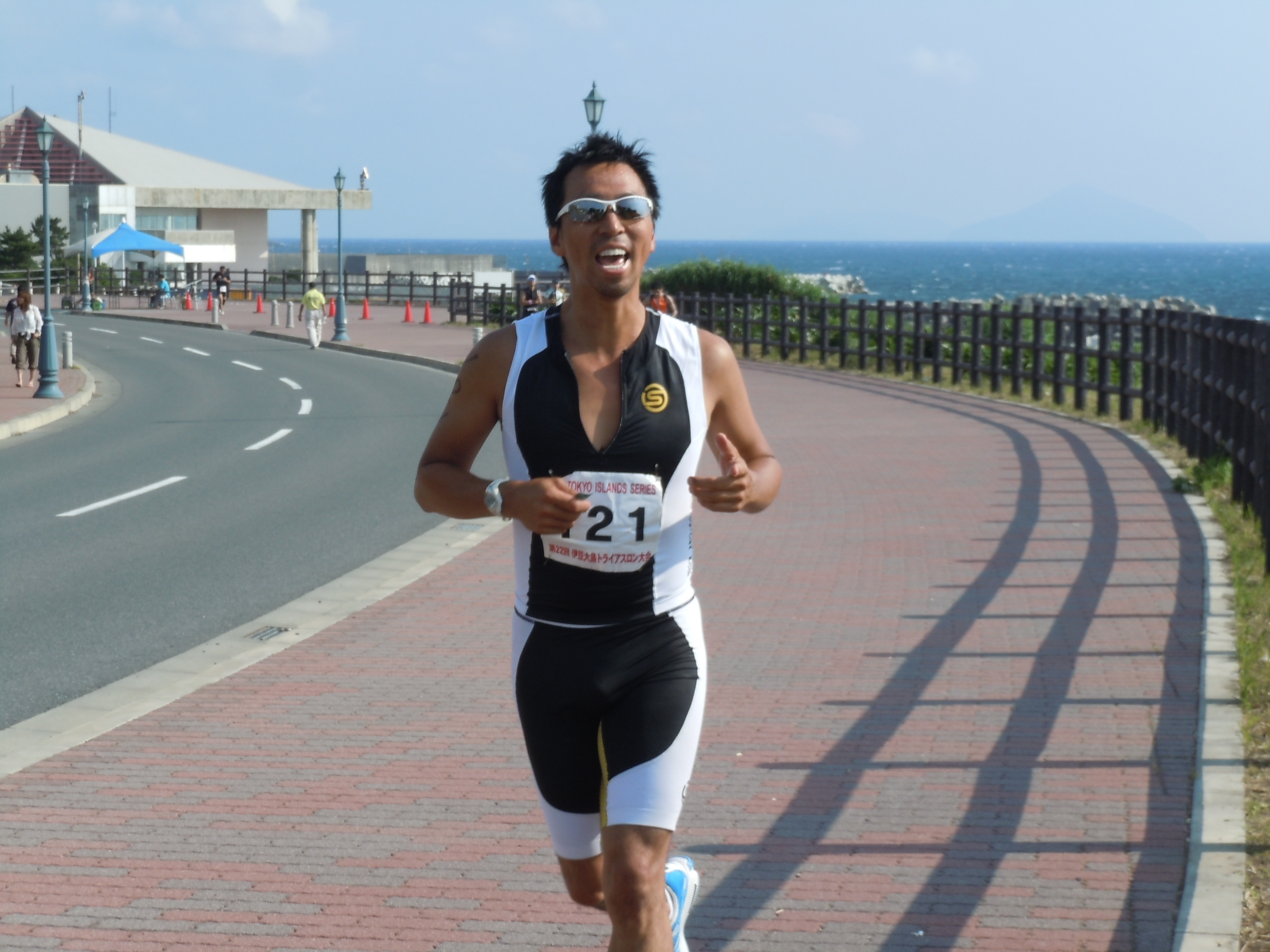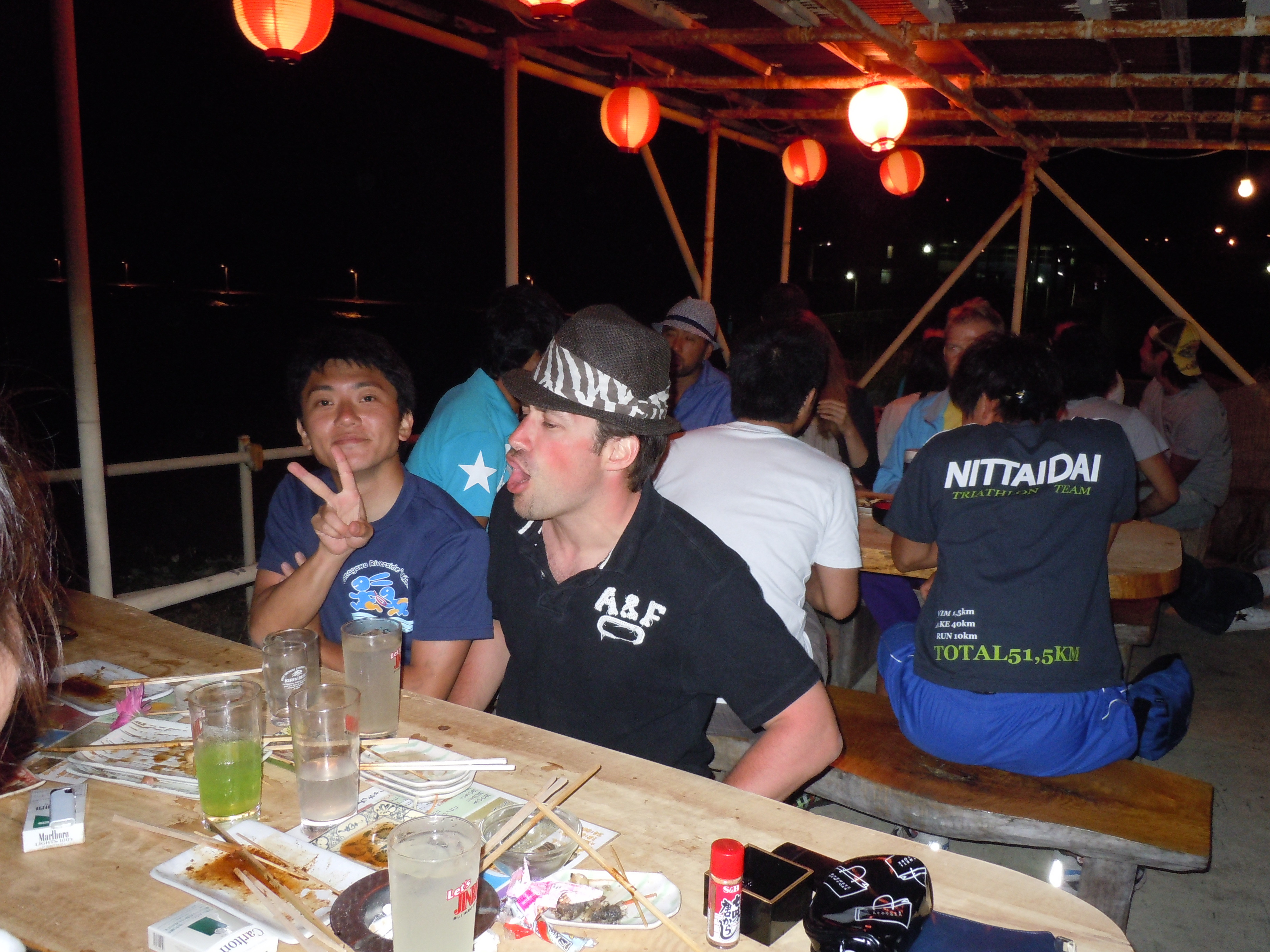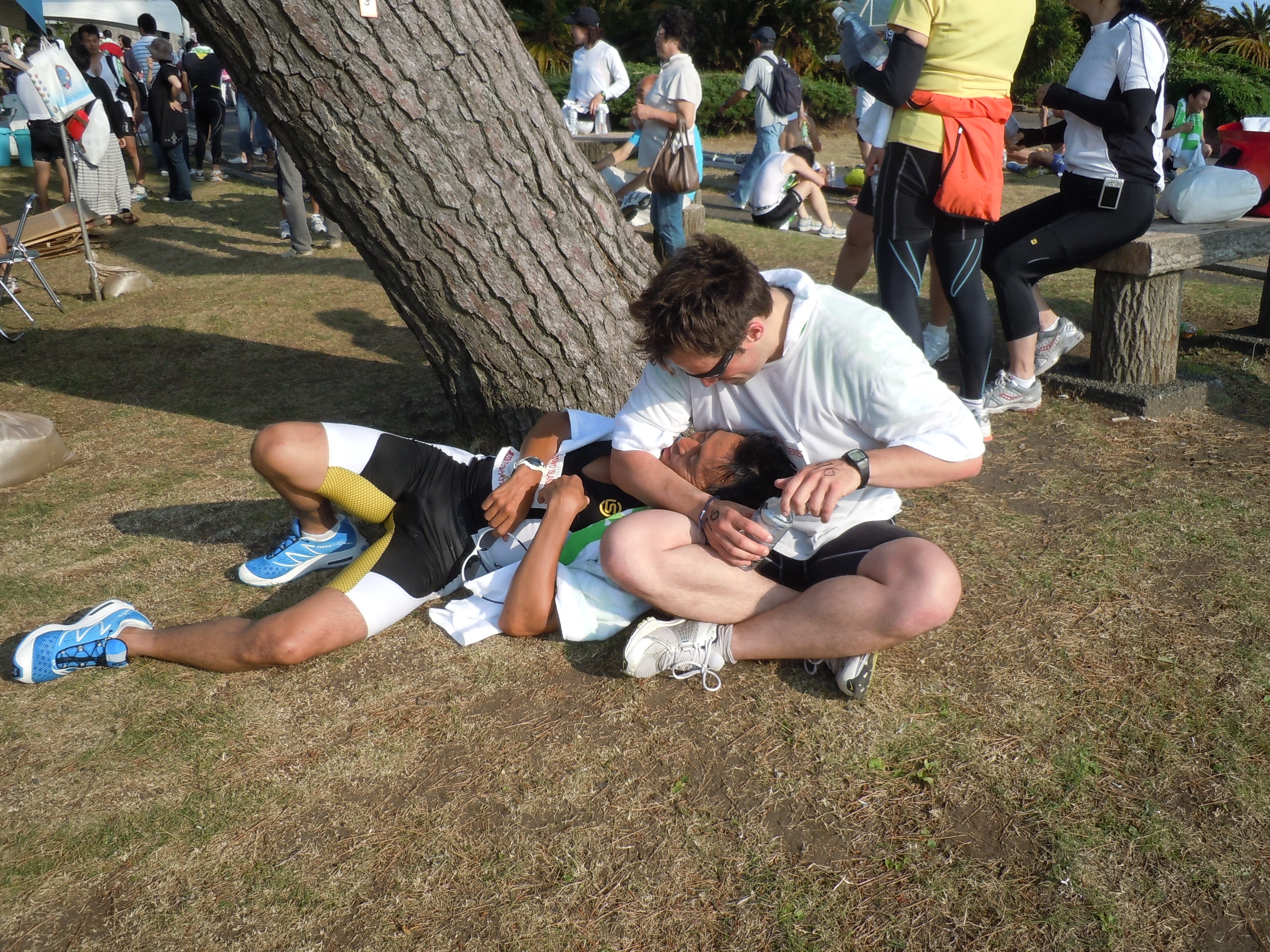 気持ちよ く♪大島の海を望みながら地獄のような、ラン10キロアップ、ダウンのある厳しいコース。。でも・・・楽しいゴール後は、やさしく介抱を・・・・(笑)夜は、表彰式&パーティ盛大に今回、共に健闘した友人!フランス人の「ファブ!!」32歳。イイ奴なんデスさ・す・がフランス人⇒スタミナあります・・・今回、彼に負けてしまいくやしい。。二次会まで・・・GRAZ近所の日体大生の伝統ある「裸 応援踊り」(笑)左側の「今井君」⇒日本人1位若さ溢れるエネルギー夜更けまで、飲み明かし・・・海岸沿いの「居酒屋」にて私は・・・睡魔が眠いぃぃGRAZ by Hide