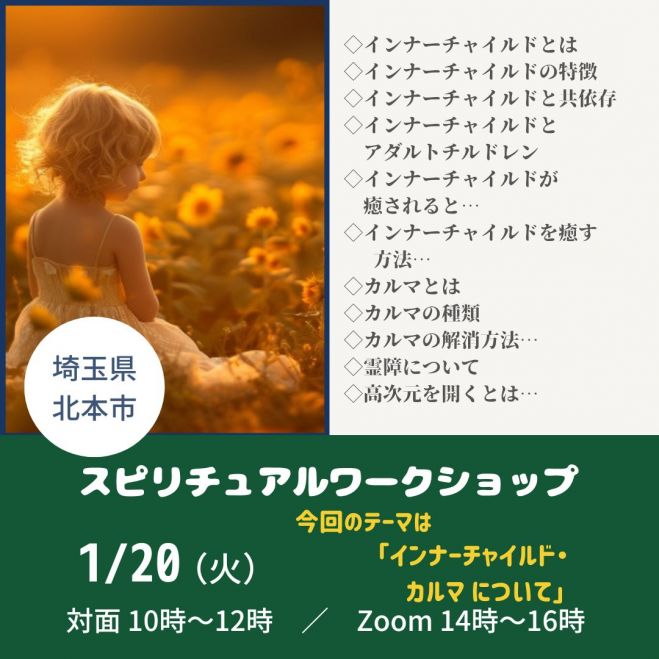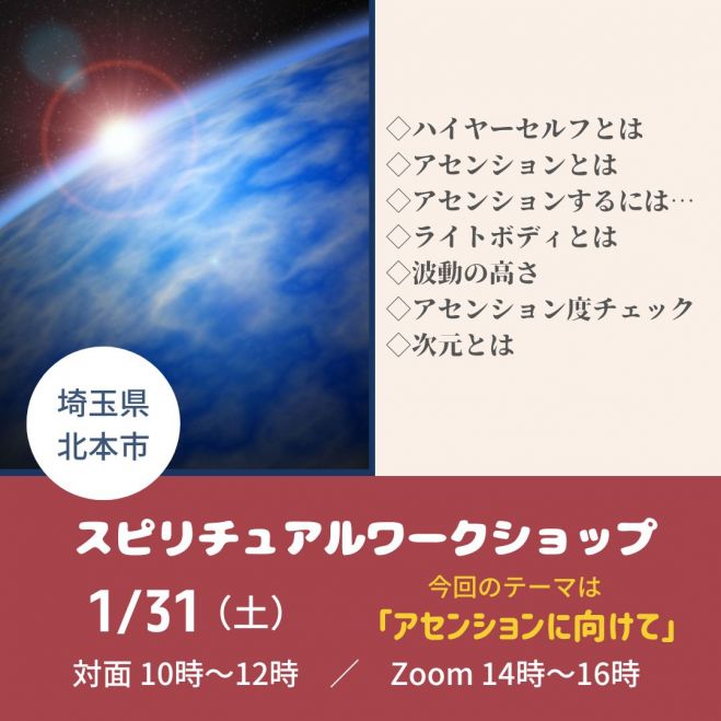 | 《 1月のイベント》 ■見えない世界を知る「スピリチュアルワークショップ」 1/31(土) テーマ「アセンションに向けて」 対面 : 10時~12時 1/31(土) テーマ「アセンションに向けて」 Zoom:14時~16時 ■癒しイベント 1/24(土)「こころころころマルシェ」 10時~16時 (会場:品川から京急線で1駅の新馬場駅から徒歩1分 寺子屋みろく) ■シャーマニックオラクルカードのワークショップ体験会 リクエスト開催により随時募集中 興味を持たれた方はお問合せ下さい。 |