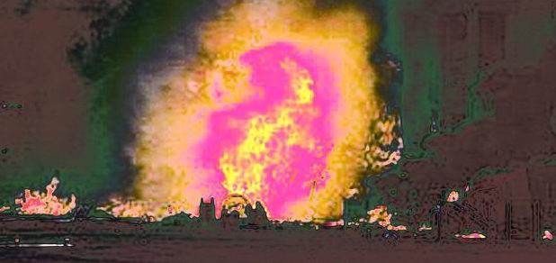 モザイクの中には、上の画像にある壁面の煤煙跡や、噴き出しているビデオ最初の異常な噴煙、下記画像にあるケロシンではない空中に浮かんだ異常な火炎、を説明できる何かがあるのかも知れません。