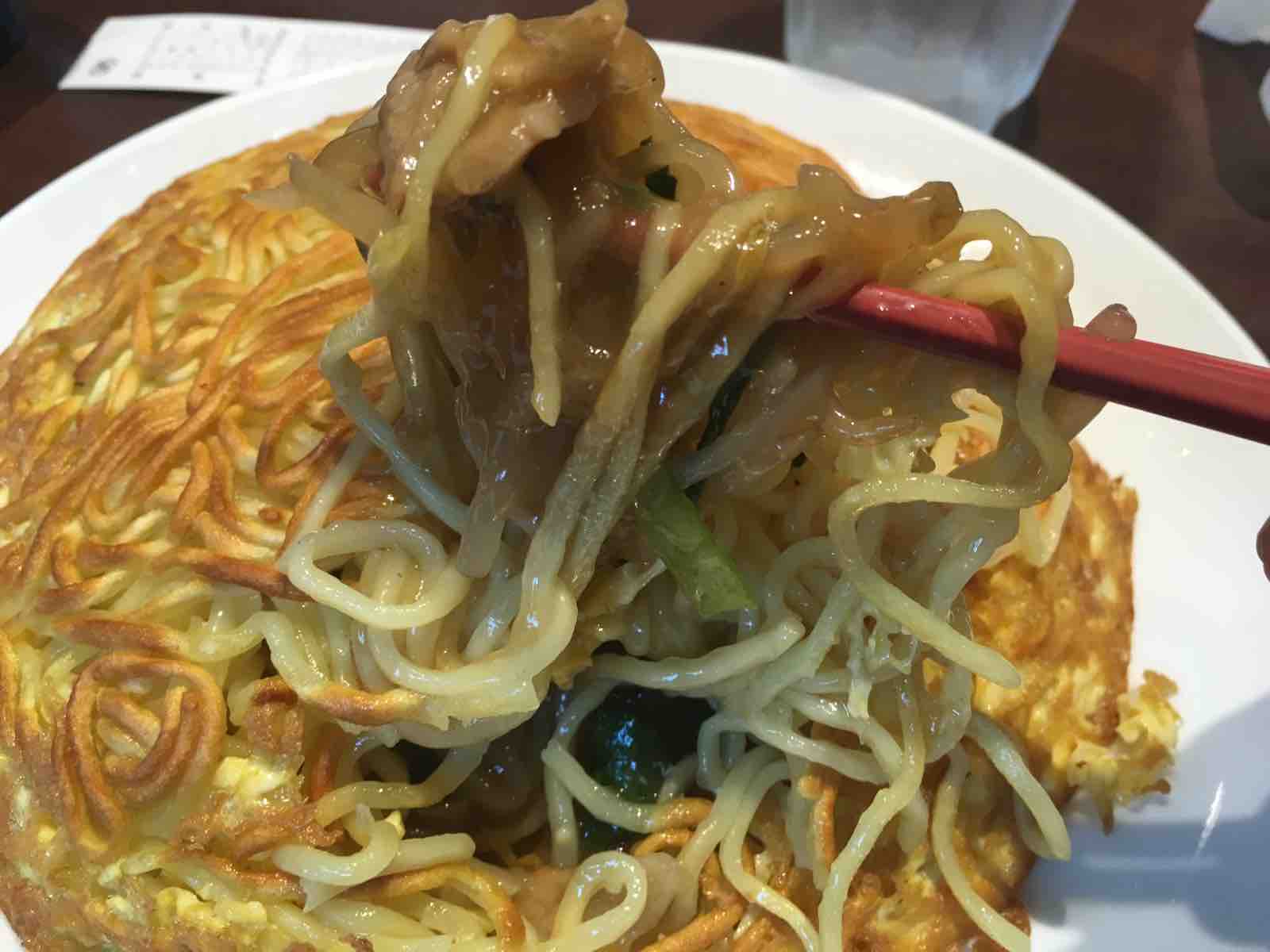 炒めた豚肉、ニラ、もやし、玉ねぎに熱々の餡をかけ、その上にカリカリに焼き上げた中華麺を乗せたものである。なので、その辺の焼きそばとは全く異なる。