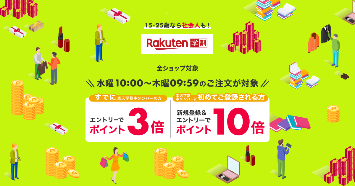 楽天学割のキャンペーン,水曜日は+2倍になります.今回,水曜日が5日なので,上記キャンペーンと併用して+3倍になります.