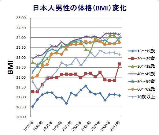 それでは実際の日本人の体格について、厚生労働省が発表している『国民健康・栄養調査』(1975年~2011年)から、日本人の平均のBMIの変化をご紹介します。