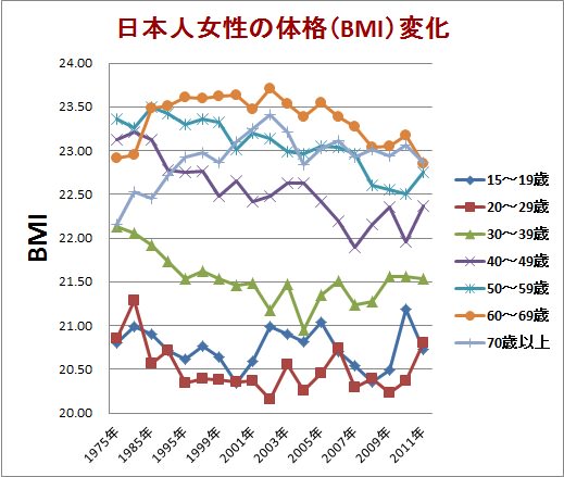 グラフの通り、近年の日本人女性はBMI指数が低下傾向にあり、以前に比べてスリム化したことが分かります。