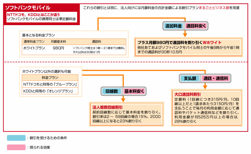 2007年1月25日 他社の料金プランと比較すると分かりやすいと思いますが、 auやドコモの場合、10.5円/ 30秒という通話料水準のプランは、 基本料金が1万円前後と割高です。 それがソフトバンクなら 980円(ホワイトプラン基本料)+980円(Wホワイト