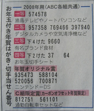お年玉付き年賀状の当選番号が発表された。来た年賀状をチェック。今年はメールを使うなどの方法で少なくしたので、来た枚数は少なめ。 いや、もっといいもの当たる方がいいけど。 平成19年用お年玉付郵便葉書及び寄附金付お年玉付年賀切手の当せん番号 . 6日 7日 8日 9日 10日 11日 12日 13日 14日 15日 16日 17日 18日 19日 20日 21日 22日 23日 24日 25日 26日 27日 28日 29日 30日 31日; 月ごとの記事一覧: 2007年: