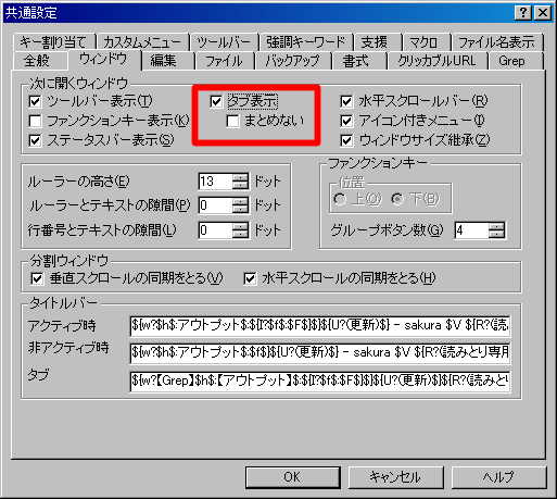 最近、タブを使用した複数のウインドウを纏める機能がついたです。でも、ちょっぴりちらつく事とタブ操作(キー、マウス両方)が物足りないのが現時点での不満点です。が、 タブを利用しないという選択肢があるので良しとしています。 サクラエディタ