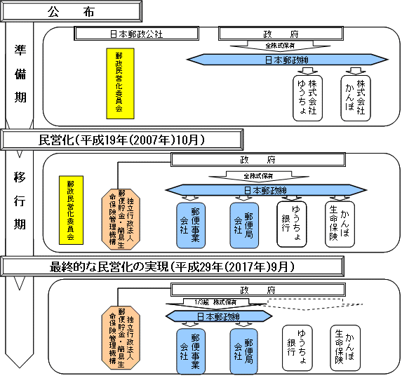 日本郵政株式会社法施行令(平成18年政令第144号) · 日本郵政株式会社法施行規則( 平成18年総務省令第3号) · 郵便事業株式会社法(平成17年法律第 fef 99号) · 郵便事業株式会社法施行規則(平成19年総務省令第36号) · 郵便局株式会社法(平成17年法律