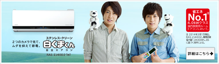 日立のエアコンに関する情報をご紹介するページです。ルームエアコンやハウジングエアコン等の情報に加え、エアコンのキャラクター、白くまくんの紹介がご覧いただけます。