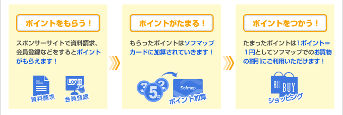 【A】ソフマップポイントゲットを利用するには、ソフマップの会員登録をして「 ソフマップカード」を取得する必要があります。 また、ソフマップ全体のポイント の確認はポイントの確認からすることができます。(※ポイント履歴とポイントの確認は