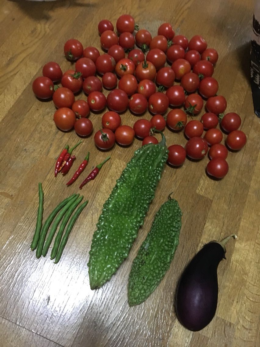 こんにちは。ところで、昨日とその前の収穫物です...。それで、でも昨日畑に行ってみましたら、もう全然駄目かと思っていた小豆が結構出来ていたので、感動しました。それで、それはまぁ小豆として収穫する前の青い物はささげと言うらしいですけど、そのいんげんみたいな感じの物が大量になっていまして、嬉しかったです...。後、ミニトマトが半端なくたくさん取れまして、数えてみたら58個もあって、しかもまだまだ青い実が付いている感じなので、こっちの方もありがたいですね。また、秋なすと大きなゴーヤ等でした...。それと、鷹の爪は放っておくと乾燥して来て自然にはじけていましたよ。後は、深夜に醤油等で煮たたかべと言う魚です...。