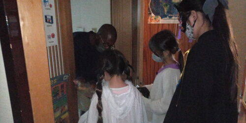 子供たちはお家に見立てたスクールのコンピュータルームや図書室を「Trick or Treat!」と元気に言いながら一軒づつ回りました。