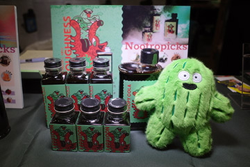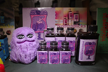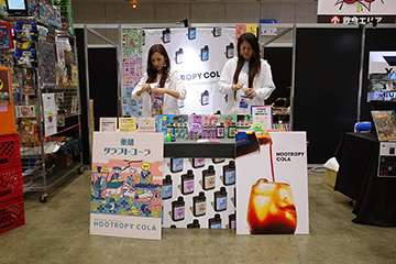 そんな大規模ブースの周囲には、Tシャツやらフィギュアやらの小売店舗・個人販売の小ブースが無数に並んでいて、その一角に今回の招待主「ヌートロピーコーラ」のブースをようやくのこと発見。ここに辿り着くまでに1時間ぐらいかかりました。手前のボードにある通り、「薬膳クラフトコーラ」の紹介・販売のブースです。