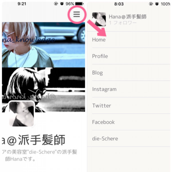 右上の≡を押すだけで、他のSNSや過去ブログ、die-Schereのホームページへ飛ぶことができます。