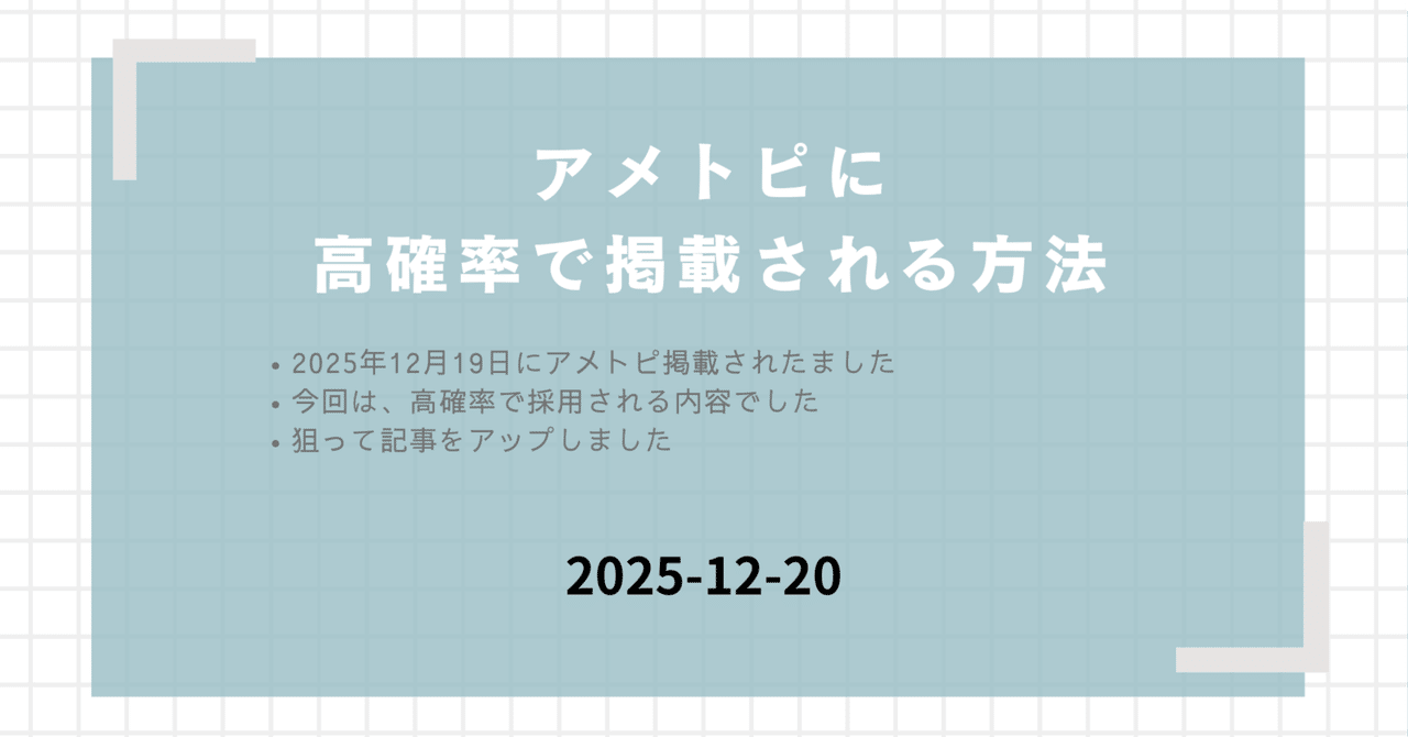 2025/12/20:高確率で掲載される方法を追記しました。実際に狙って書いてアメトピ掲載されました。だれでも挑戦できる方法です!