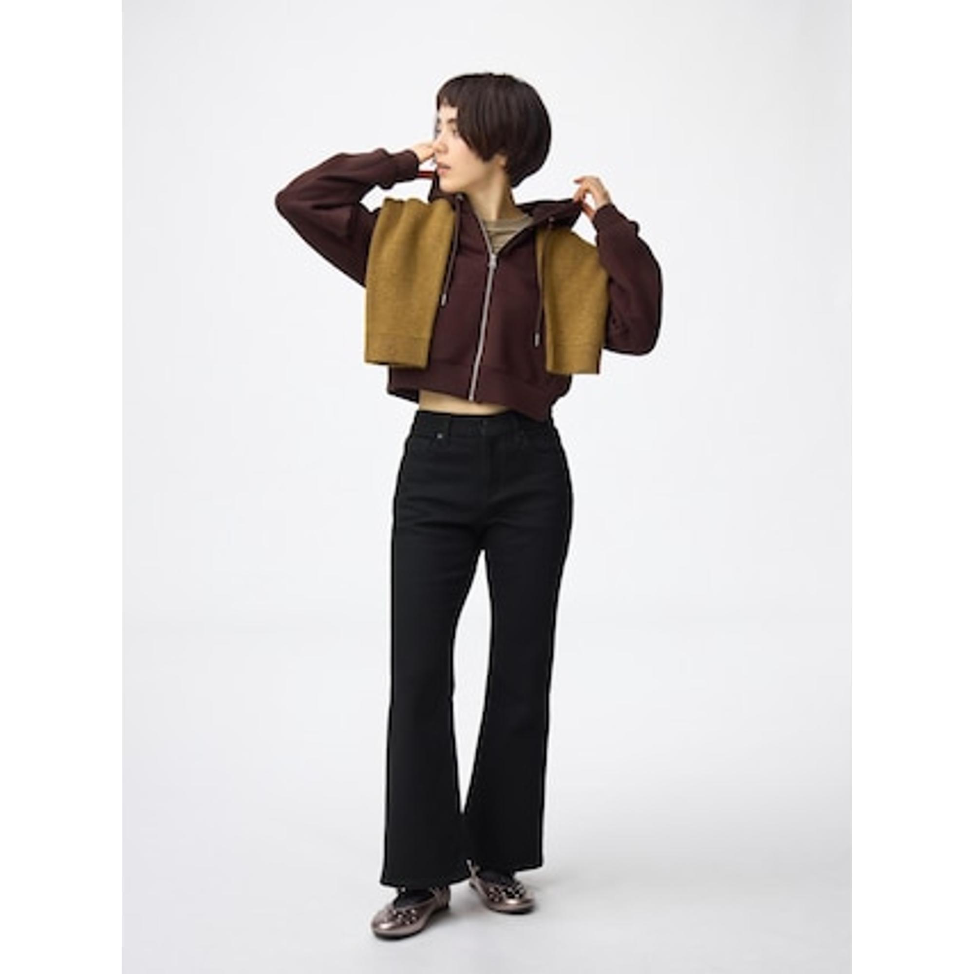 ユニクロのスマートフレアトラウザージーンズ(写真右)と比較してみました!GUは結構しっかりジーンズですが、ユニクロはいわゆるキレイめのパンツをデニム生地にした感じです。GUの方がフレアが強く、脚長感はこちらの方が出ると思います。ユニクロはストレッチがめちゃくちゃ効いてるので楽ちんです。