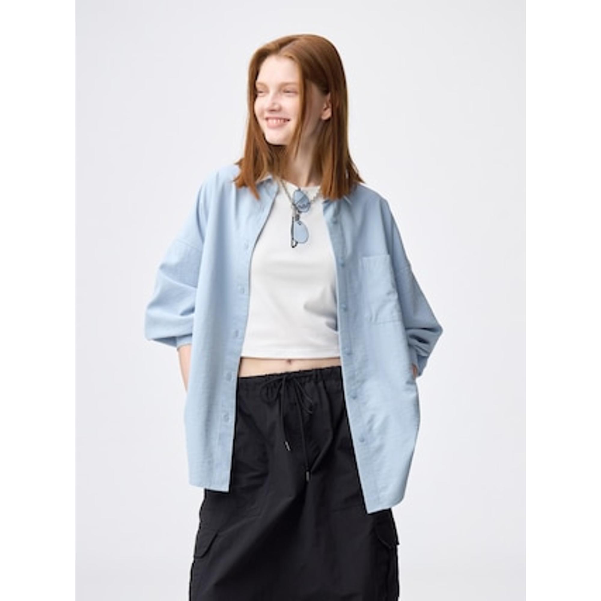 パーカーの下に着たのは、GUのドルマンスリーブシャツ。ノーアイロンでOKなので扱いが楽ちん。ウエスト周りを隠してくれる丈の長さがあるので細身のパンツとも相性ばっちりです![]()