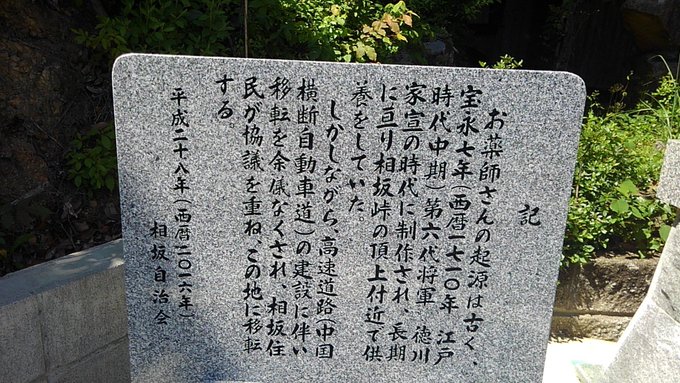 お薬師さまです。元は相坂峠の頂上におわしたのですが、中国自動車道の建設に伴い、移転を余儀なくされたそうです。
