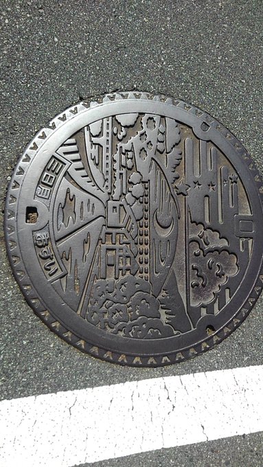 三日月のマンホール蓋。山肌に木で描かれた三日月がある三方里山と 星や雲など町の様子を描いたデザイン。 三方里山は、幕末に三日月藩が演武場として造成したところ。
