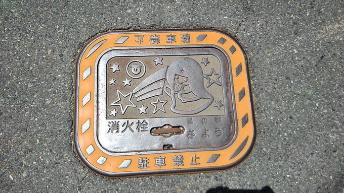 佐用町の消火栓マンホール蓋。マスコットキャラクター佐用姫と、その周りに流れ星とたくさんの星。11:24:29