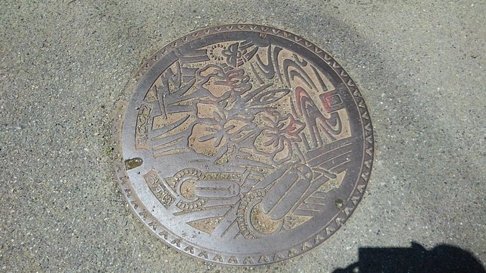 旧上月町のマンホール蓋。町の花ハナショウブとホタルのデザイン。 13:07:06